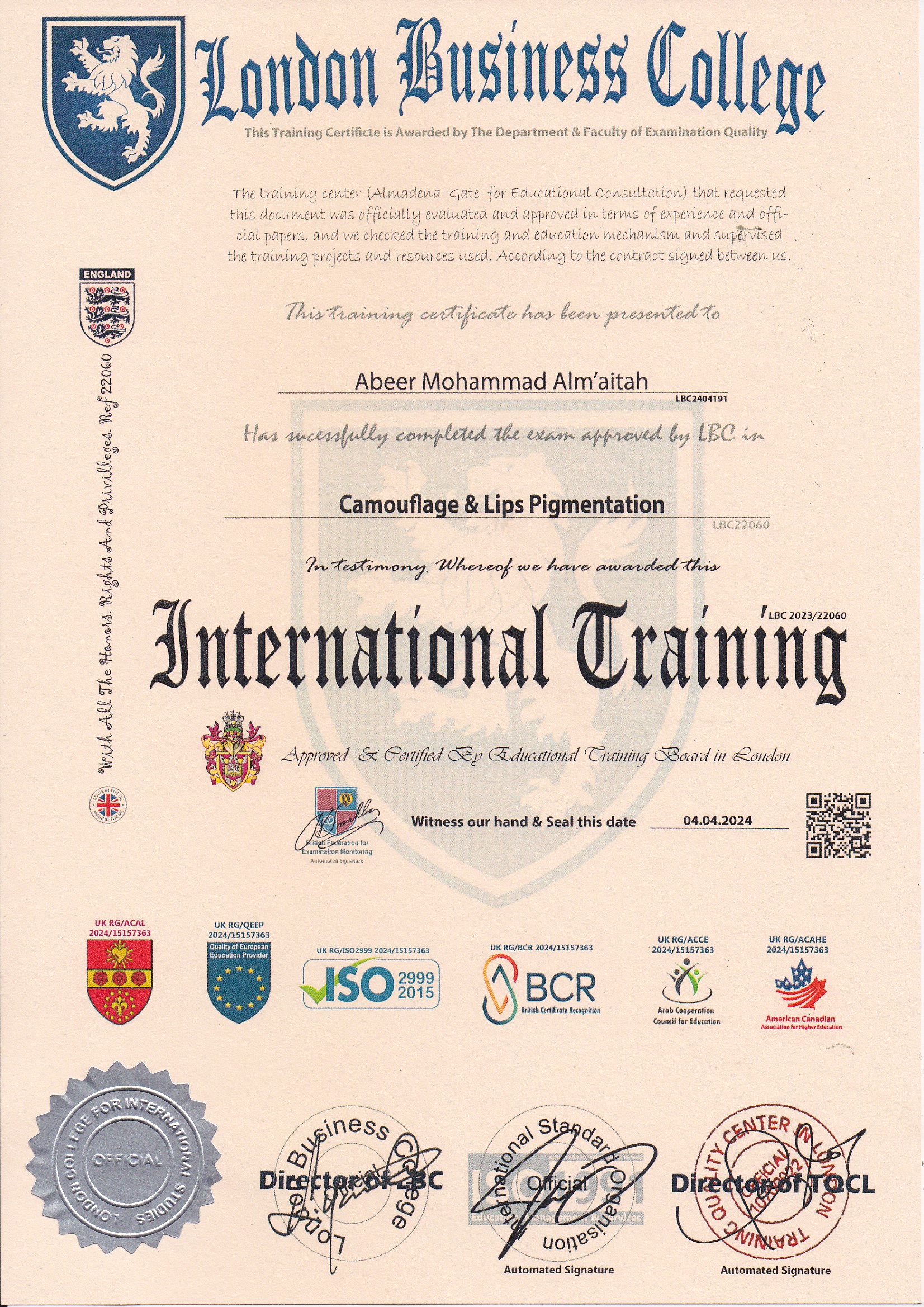 Approved by (Training Quality Center in London)