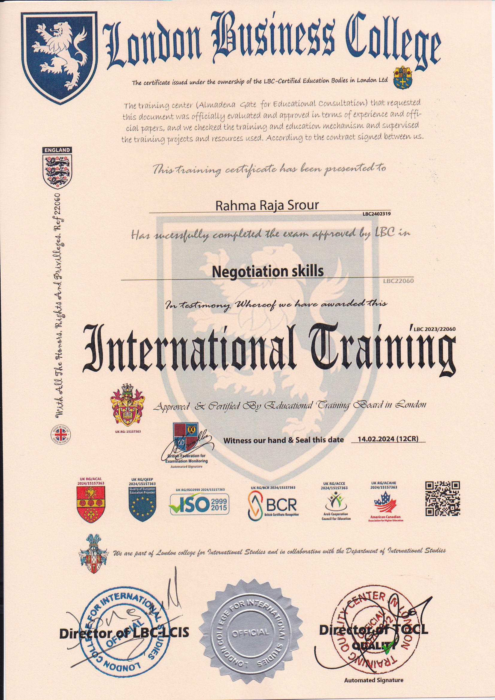 Approved by (Training Quality Center in London)