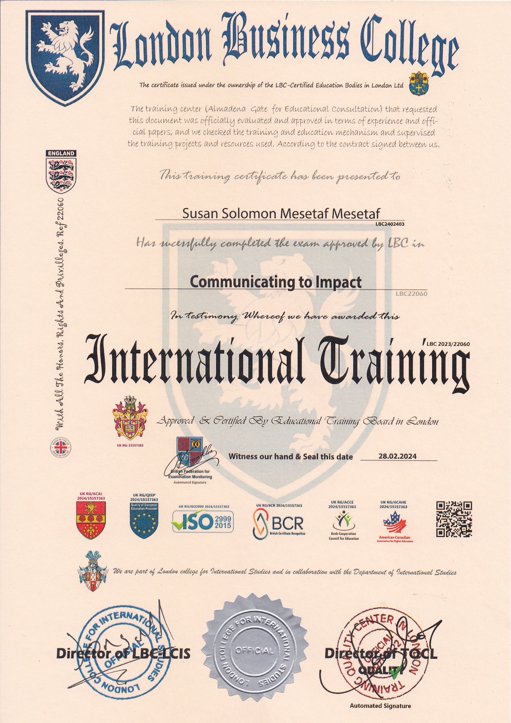 Approved by (Training Quality Center in London)
