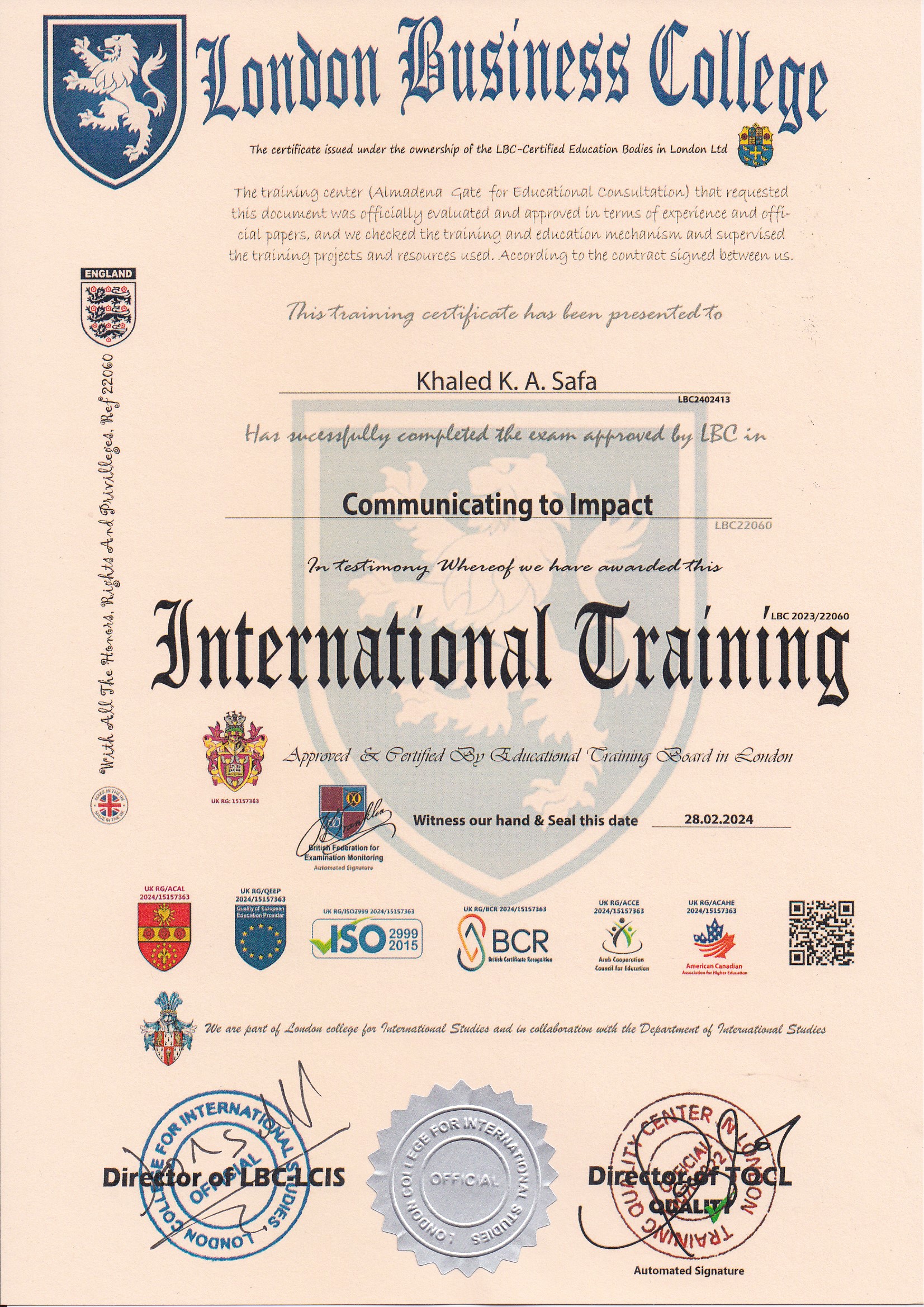 Approved by (Training Quality Center in London)