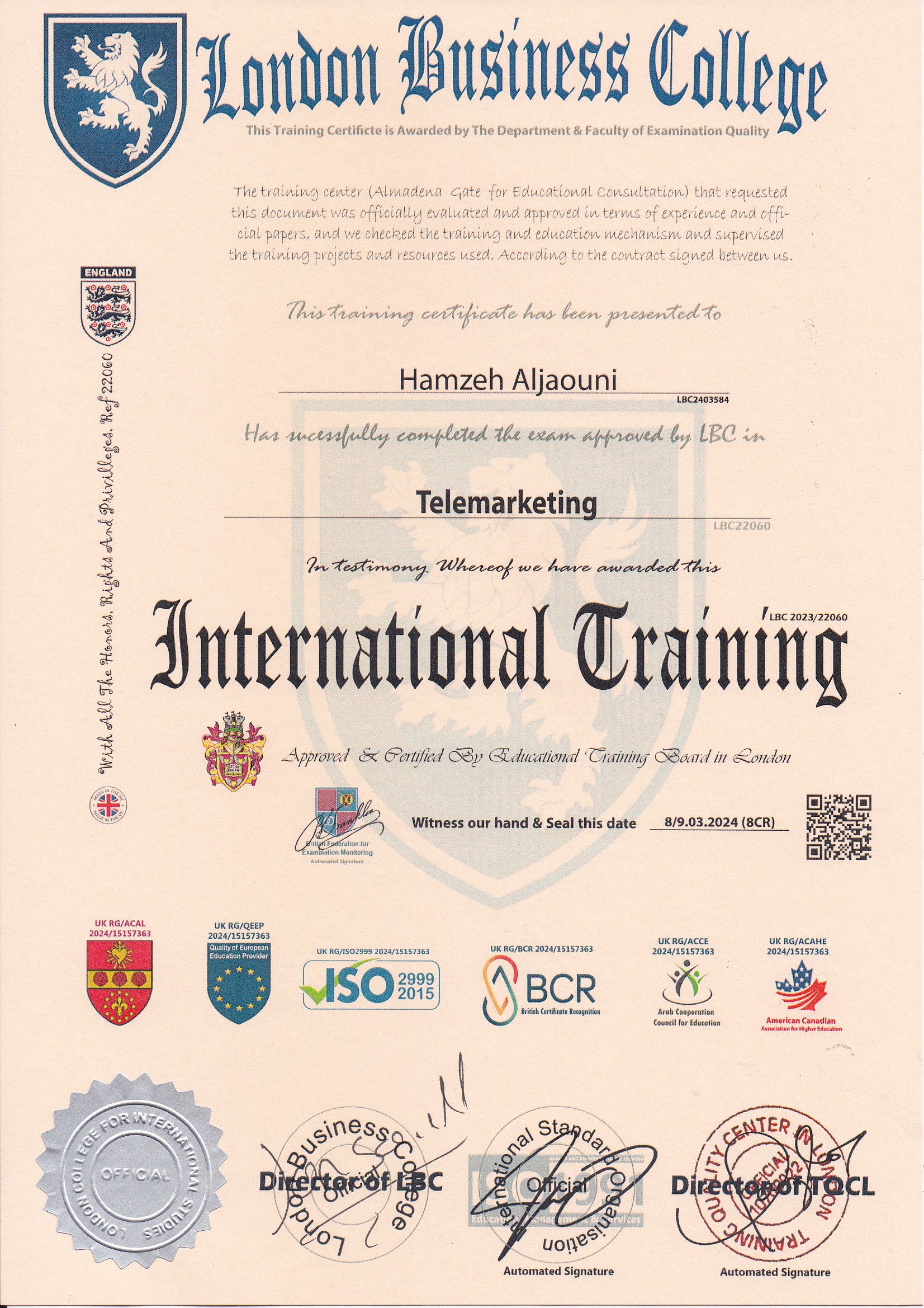 Approved by (Training Quality Center in London)