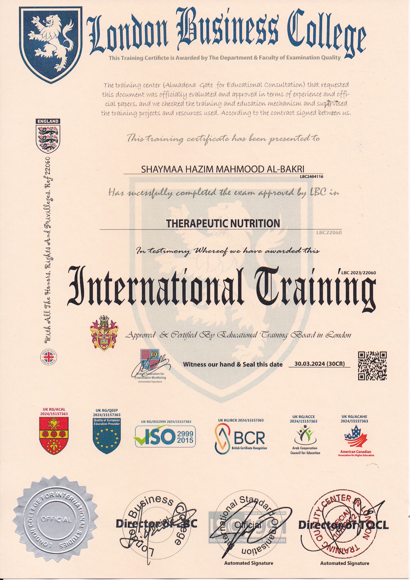 Approved by (Training Quality Center in London)