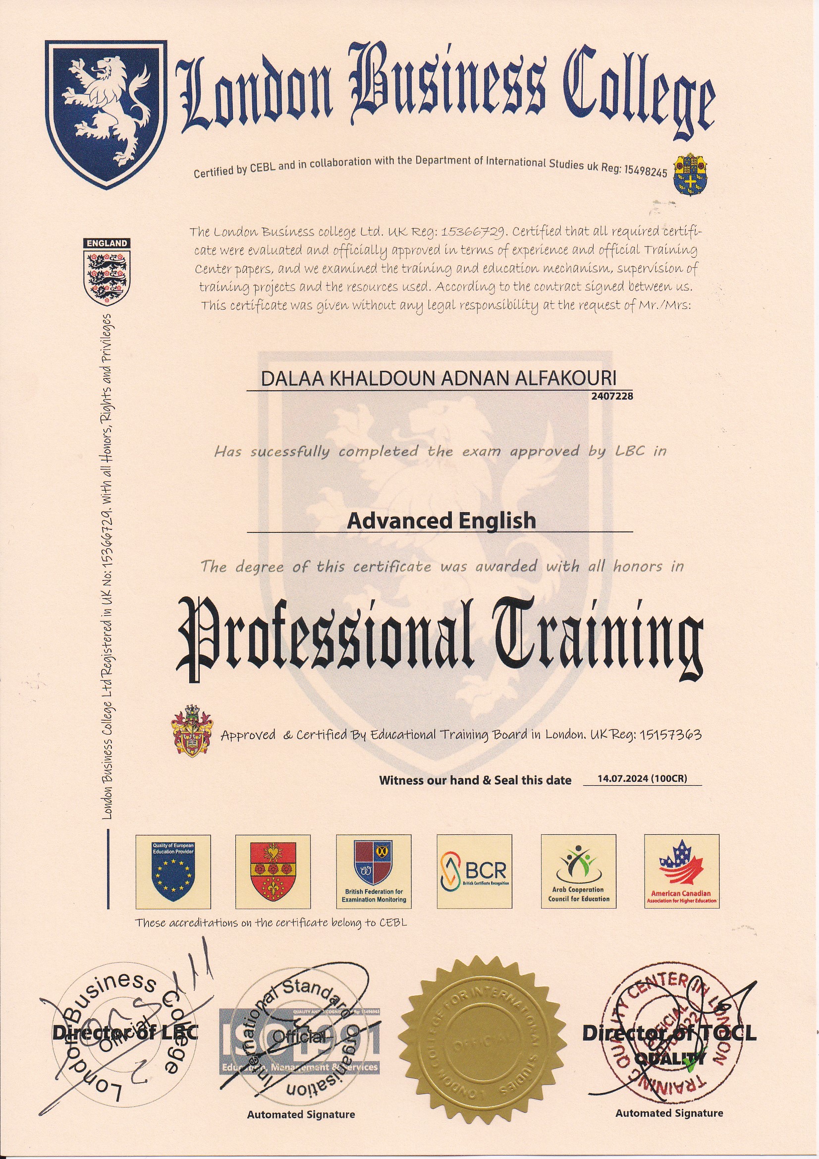 Approved by (Training Quality Center in London)
