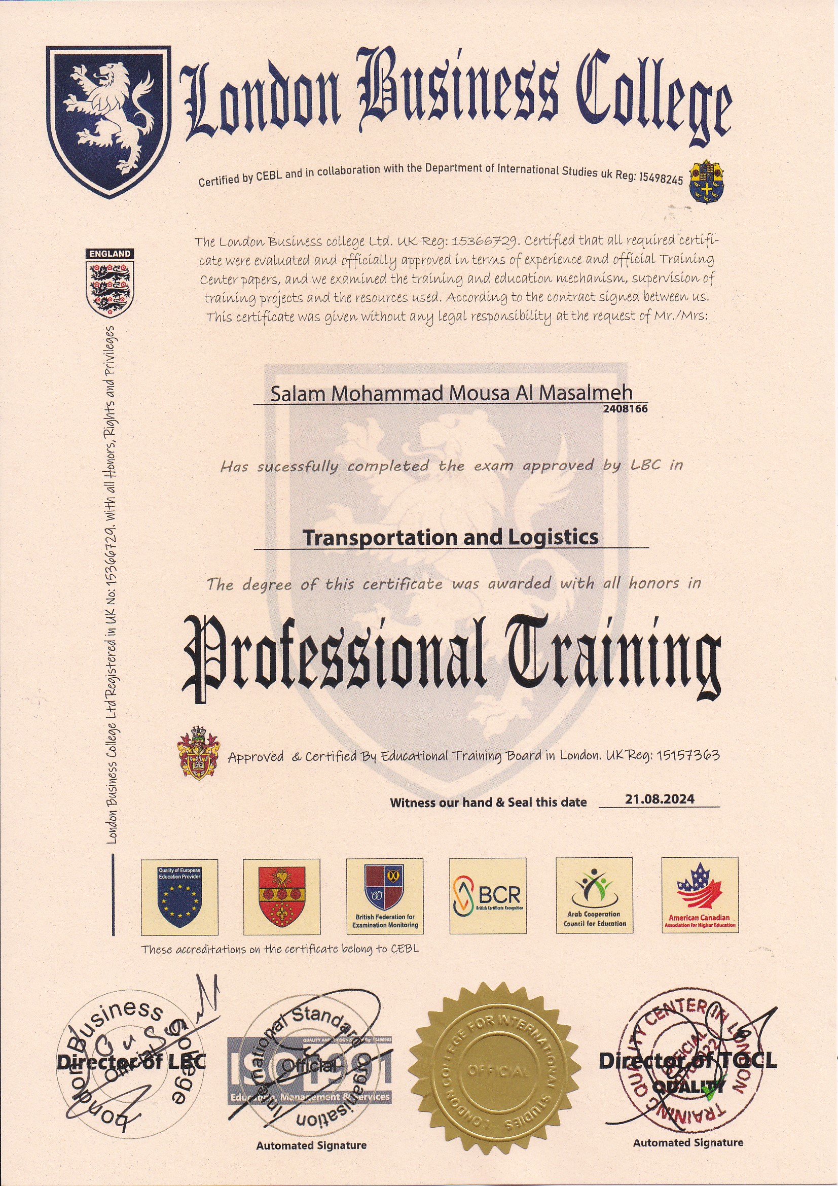 Approved by (Training Quality Center in London)