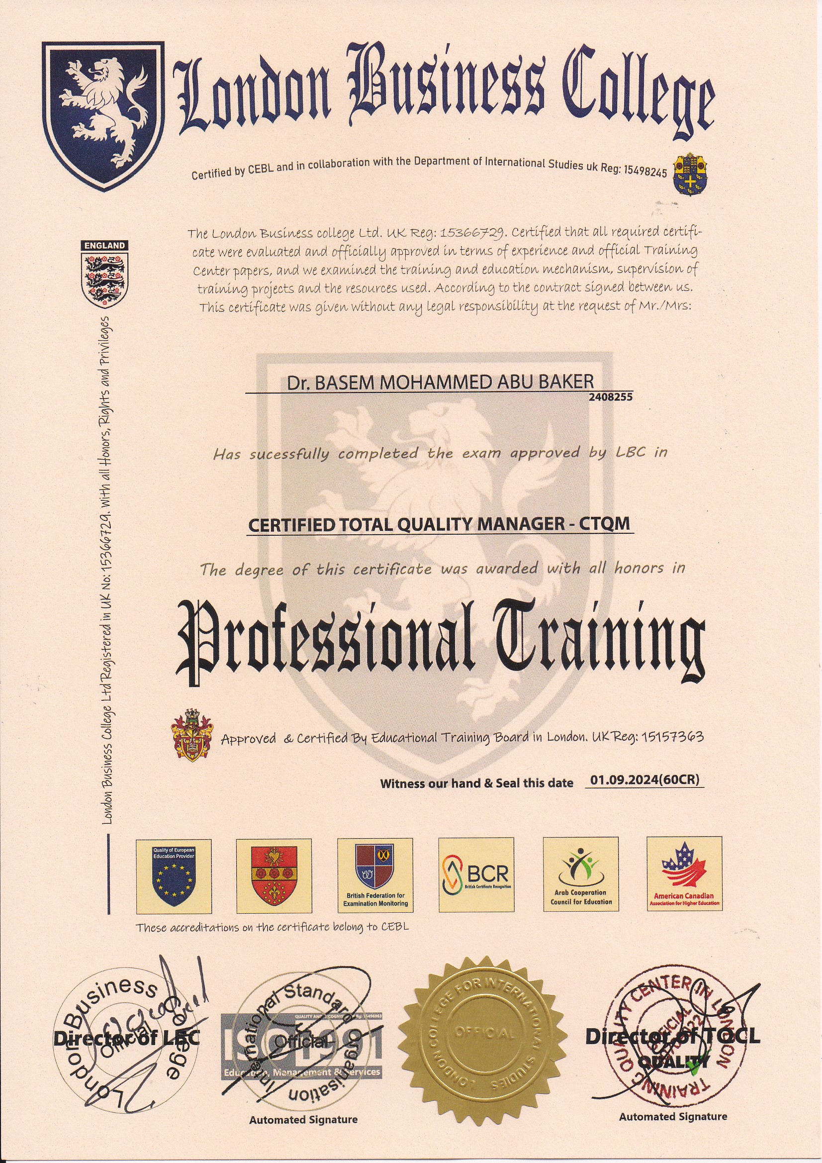 Osama Ayash/CERTIFIED TOTAL QUALITY MANAGER (CTQM)