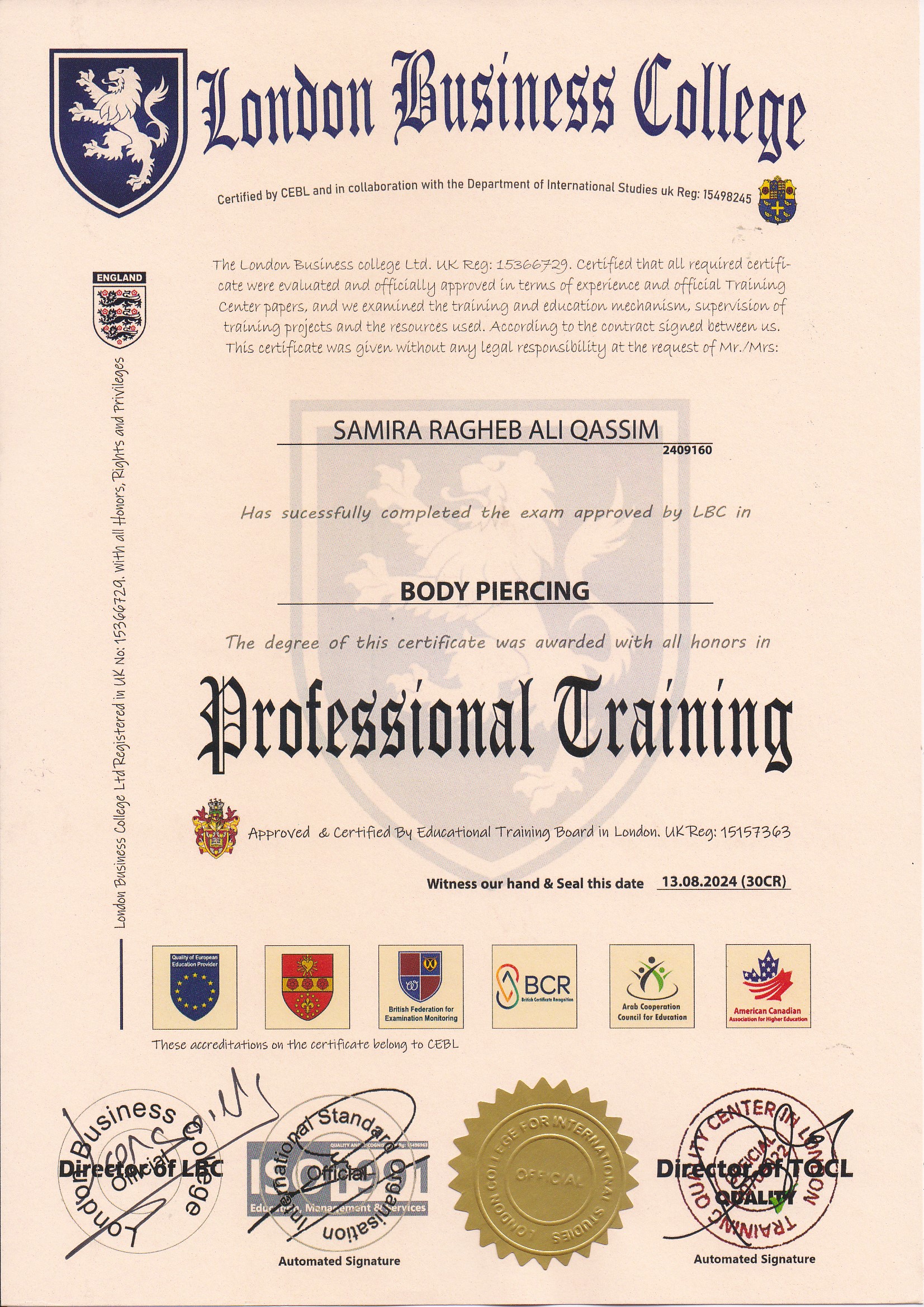 Approved by (Training Quality Center in London)