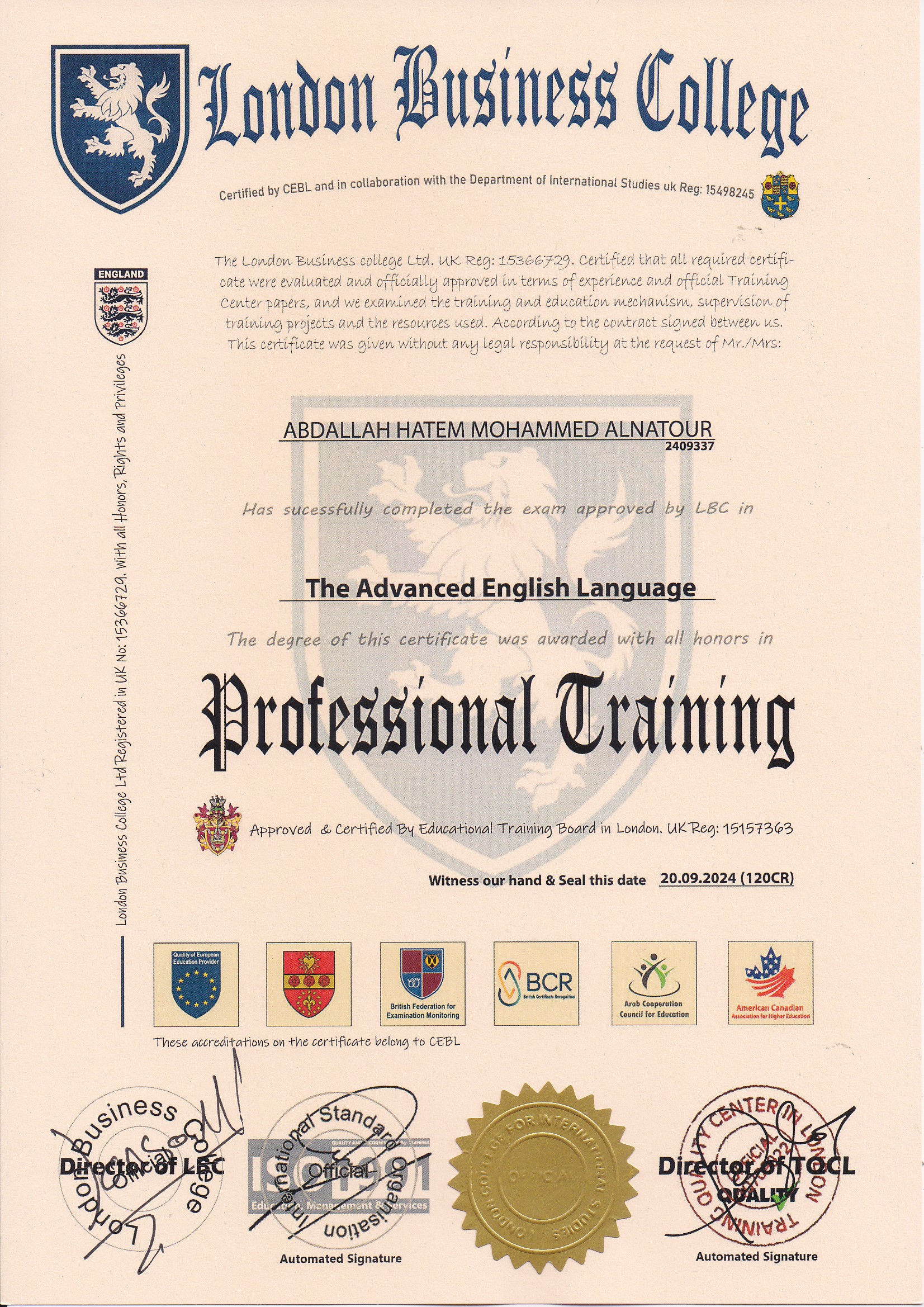 Approved by (Training Quality Center in London)