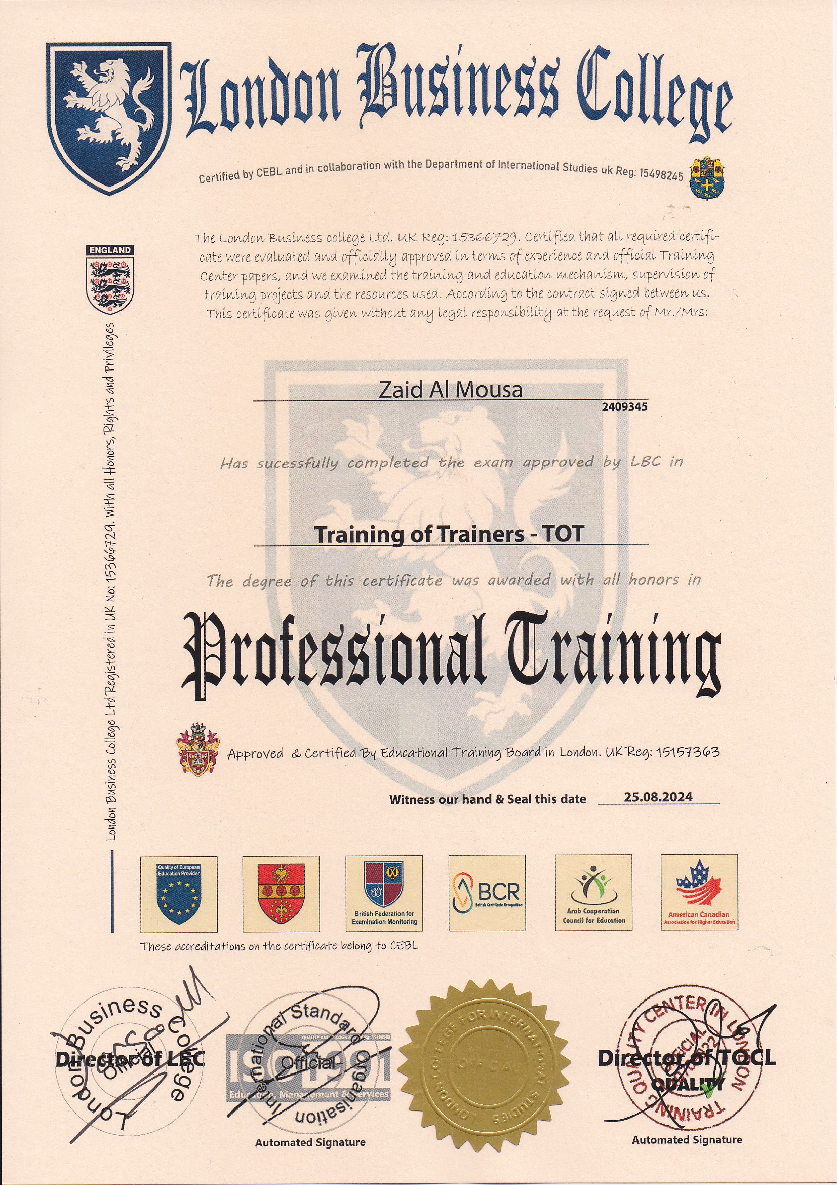Approved by (Training Quality Center in London)