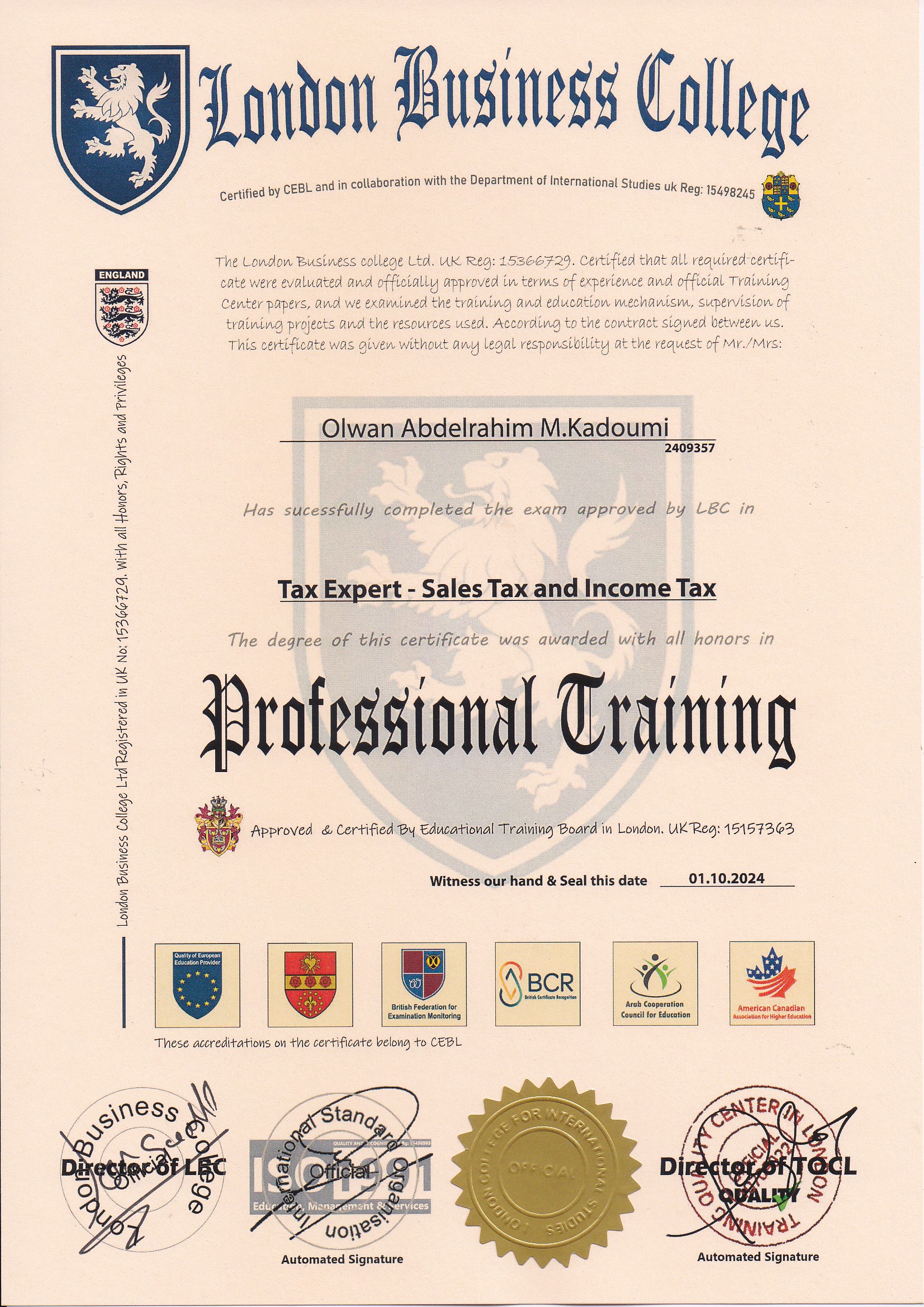 Approved by (Training Quality Center in London)