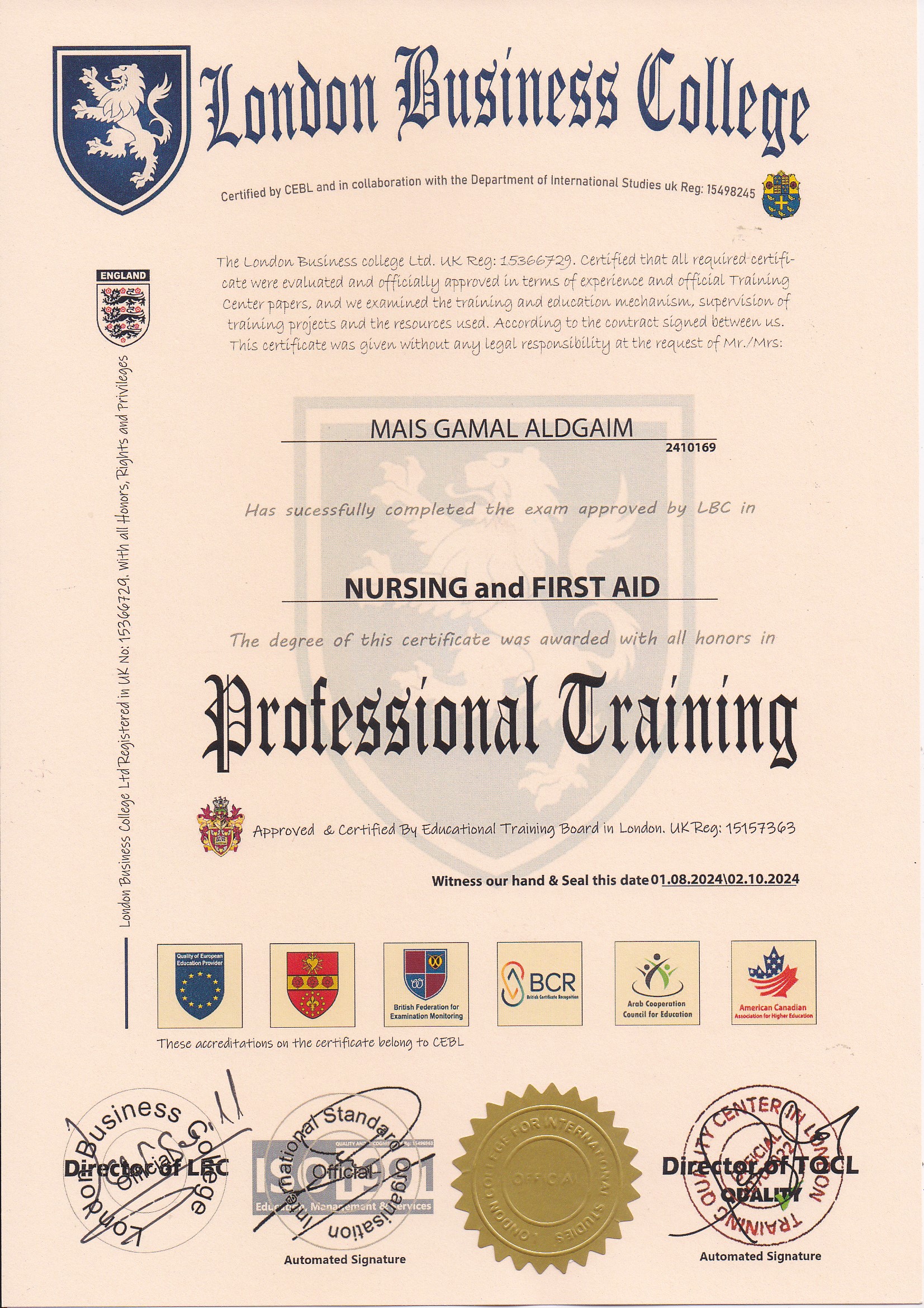 Approved by (Training Quality Center in London)
