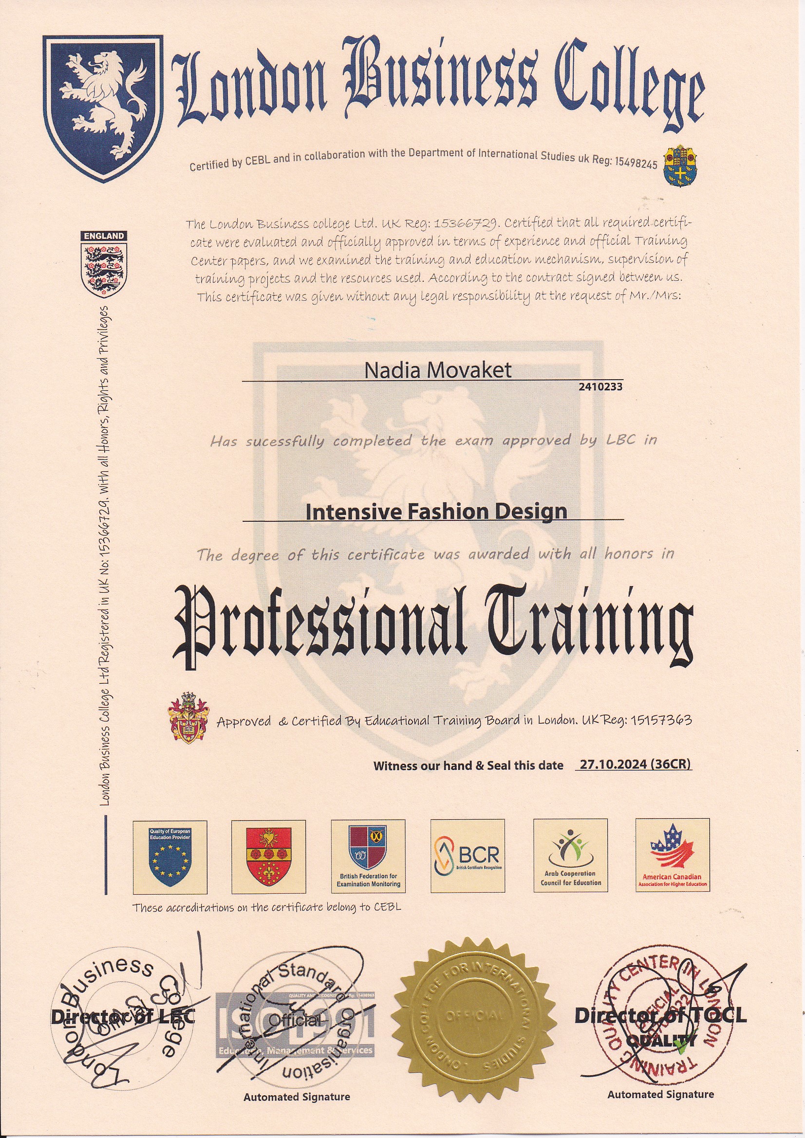 Approved by (Training Quality Center in London)