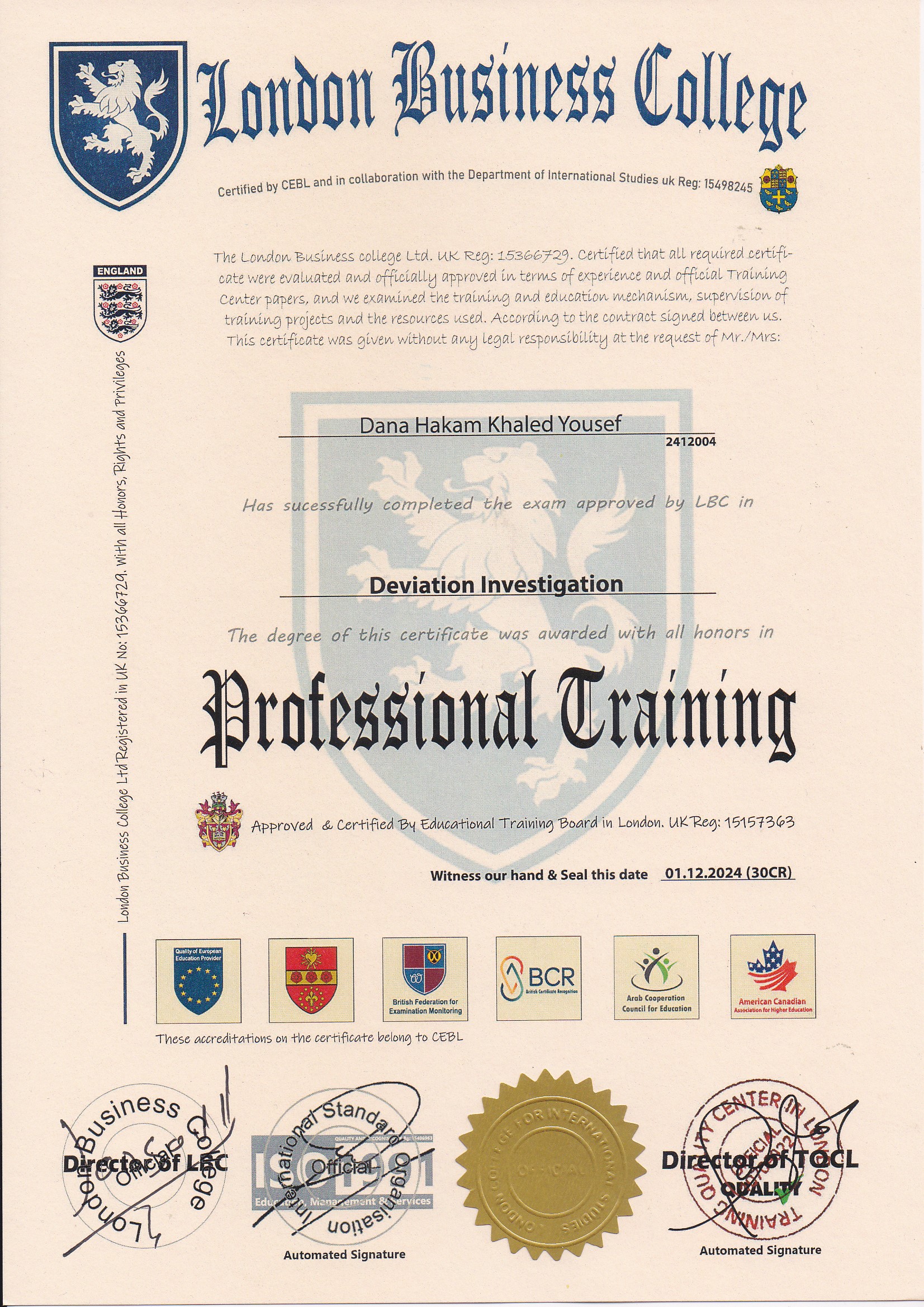 Approved by (Training Quality Center in London)